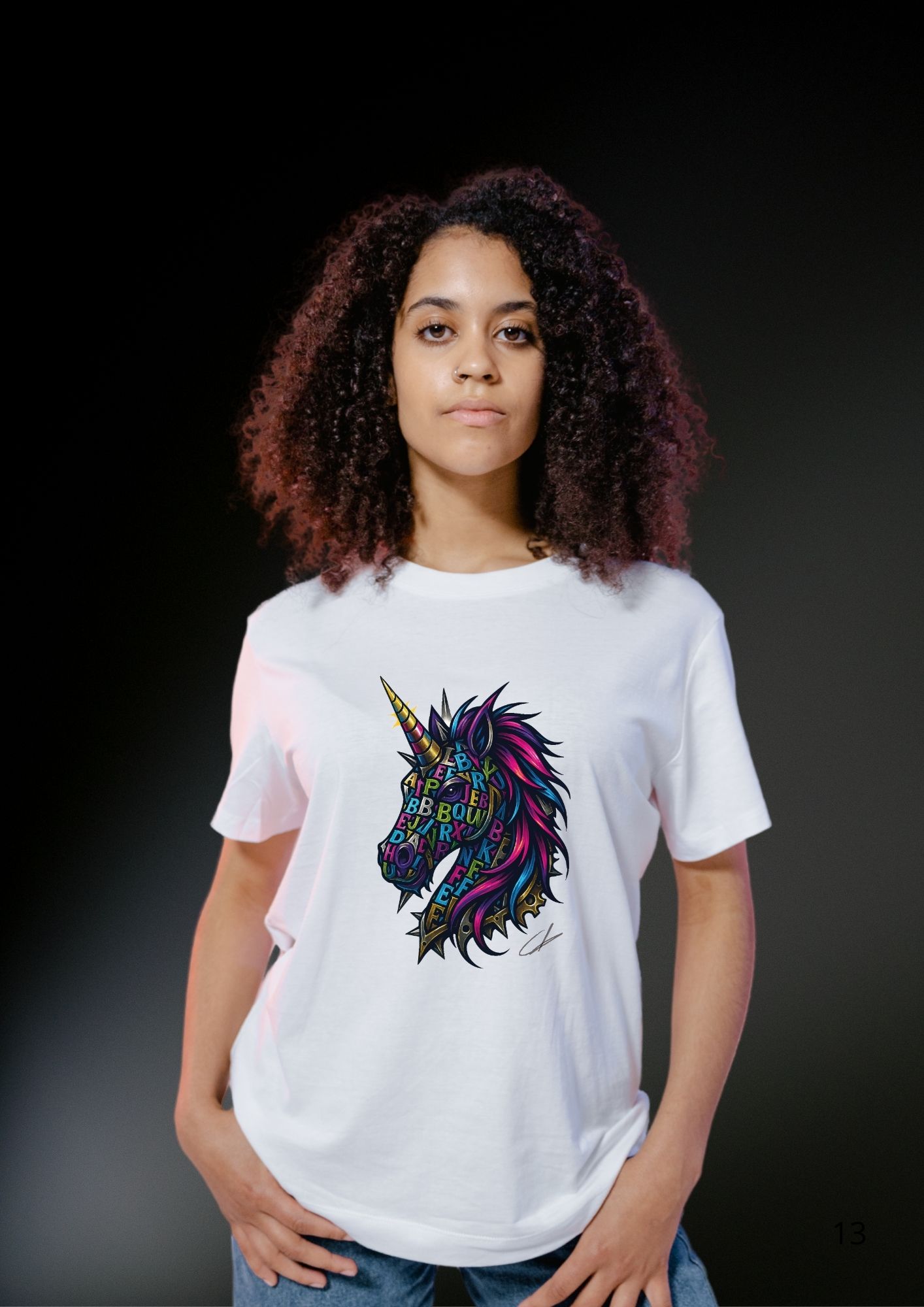 Affirme ton style avec ce t-shirt licorne artistique pour femme, un design visuel fort où la licorne se dessine à travers un jeu de lettres, de formes et de couleurs vibrantes. Chaque détail compose une silhouette unique, moderne et expressive, pensée pour celles qui aiment porter un message créatif et audacieux.